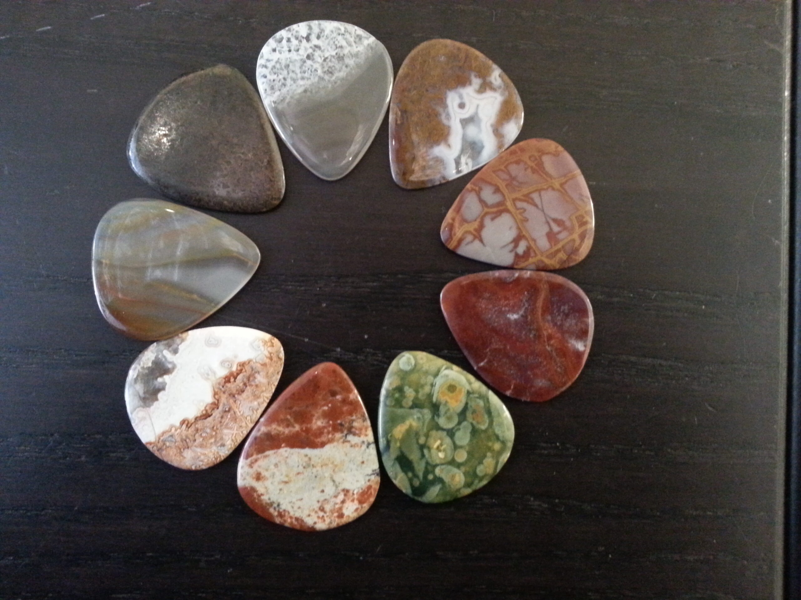 You may or may not know but this site was born of this product. I get a lot of requests for photos of these picks so I thought I would give them a feature page. These Gemstone Guitar Picks are all made from different types of jasper, agate and petrified dinosaur bone. That is correct -dinosaur bone.